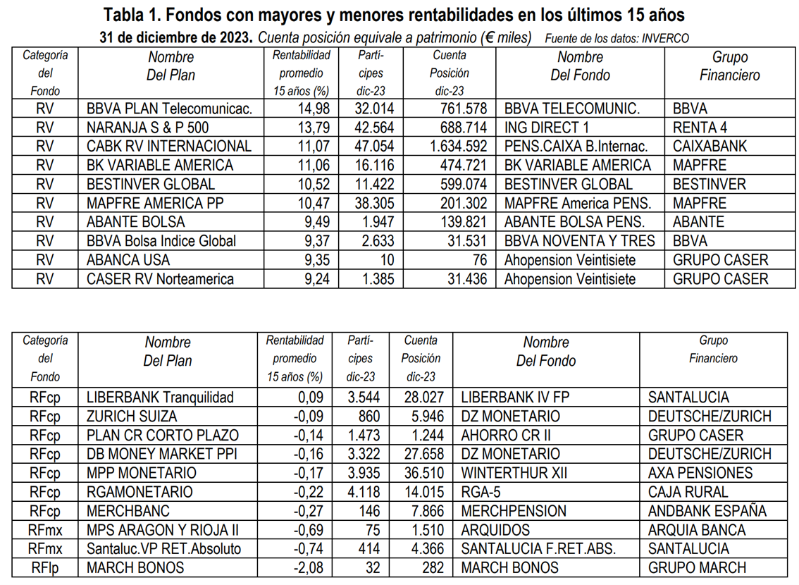 La rentabilidad media de los fondos de pensiones en España en los últimos 15 años fue del 2,91%, inferior a la rentabilidad media del Ibex 35 (5,34%) y los bonos del Estado español a 15 años (3,99%). La rentabilidad media del Eurostoxx 50 fue 8,09% y la del S&P fue 14%, casi tres veces más que la bolsa española.