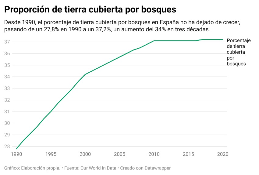 Si nos detenemos en el caso de España, vemos que la situación ha sido muchísimo mejor, ya que desde 1990 hasta la actualidad la masa forestal en nuestro país ha aumentado un 34%, pasando de un 27,8% de masa forestal a un 37,2%.