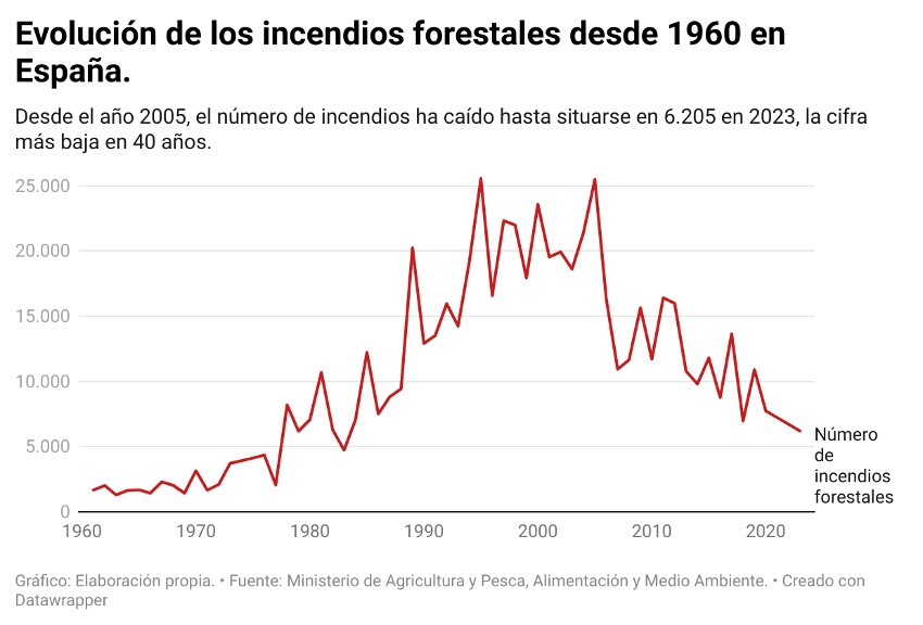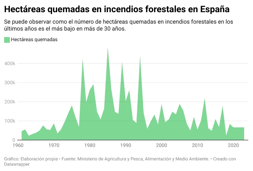 Hay quien pudiera pensar, ¿y cómo es esto posible si cada vez hay más incendios y cada vez son más destructivos? Pues la realidad es que no es así, de hecho, tanto el número de incendios como la capacidad de destrucción de estos está en mínimos desde hace varias décadas, tal y como vamos a ver a continuación.