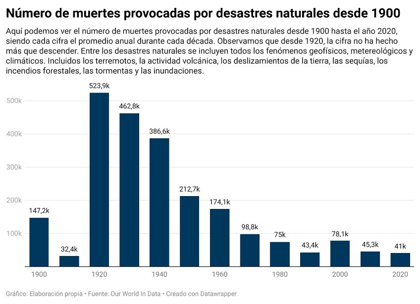 Esta es otra de las cuestiones en las que hemos mejorado sustancialmente en los últimos 100 años, y es que mientras en los años 20 del siglo pasado murieron más de medio millón de personas por año debido a desastres naturales, o más de 462.000 personas anualmente durante los años 30 del mismo siglo, en la década del 10 del siglo XXI la cifra se ha reducido a 45.300 personas fallecidas en promedio. Esto se debe en muy buena medida a los avances en la tecnología, que nos han permitido predecir cuándo se van a producir dichos desastres naturales y actuar para evitar el mayor número de muertes posibles, así como también de daños materiales.