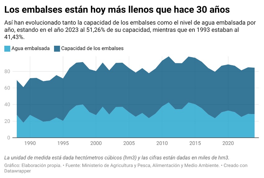 Este dato es muy llamativo y es que, mientras se alerta continuamente sobre las sequías, sobre el control a la población del agua consumida o utilizada, etc., la realidad es que los embalses españoles están hoy más llenos que hace tres décadas. Habiendo estado en el año 2023 al 51,26% de su capacidad, mientras que en 1993 estaban al 41,43%, es decir, diez puntos menos en comparación con la actualidad.