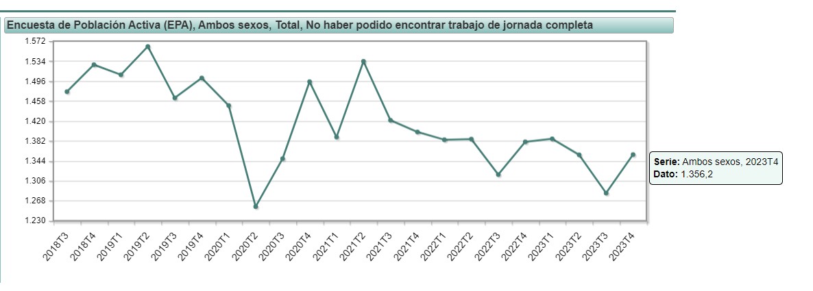 Sin embargo, aunque la responsable del departamento de Trabajo insista en que hay que trabajar menos, lo cierto es que casi a la mitad de esos trabajadores a tiempo parcial les gustaría trabajar más. Este es otro de los resultados interesantes de la última EPA: de los 2,86 millones de empleados con jornadas reducidas, un total de 1,35 millones no ha podido encontrar un trabajo a jornada completa, por lo que le se ven obligados a trabajar menos horas.