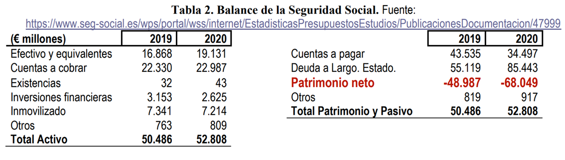 Sin embargo, lo más grave es que tampoco alcanza y la Seguridad Social tiene que tirar de deuda para pagar en tiempo y forma todas las pensiones públicas mes a mes. Tanto es así que registra patrimonio neto negativo (su pasivo es superior al activo), en una cuantía próxima a 70.000 millones de euros en 2020.