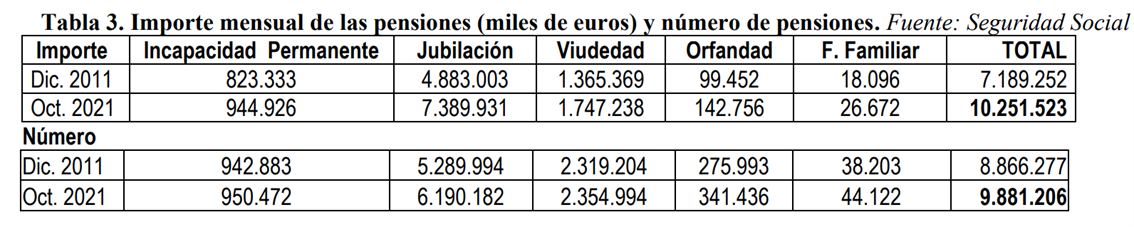 Otro dato alarmante que incluye el informe es la evolución del número de pensiones y su importe durante los últimos años. Y es que, entre 2011 y 2021, el número de pensiones aumentó un 11,4%, pero su importe mensual, es decir, el gasto destinado a esta partida, se disparó un 42,6%.