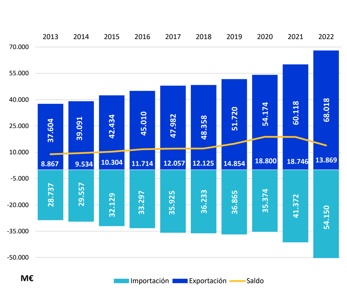 En primer lugar, porque el sector agroalimentario, pese a todas las dificultades, es muy competitivo, tal y como prueba su constante y abultado superávit comercial. España vende al exterior en agricultura, ganadería y pesca mucho más de lo que compra de fuera. Las exportaciones agroalimentarias y pesqueras se situaron en 68.000 millones de euros en 2022, mientras que las importaciones fueron de 54.000 millones.