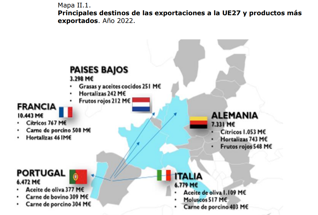 La UE es el destino del 64% de las exportaciones agroalimentarias y pesqueras de España. Y lo curioso es que Europa también es el principal proveedor de alimentos que llegan de fuera, con casi el 50% de las importaciones. En concreto, Francia es el principal socio comercial de España en el ámbito agroalimentario, ya que es el principal destino de las exportaciones (10.400 millones) y también de las importaciones (6.700 millones). Le siguen Alemania e Italia.