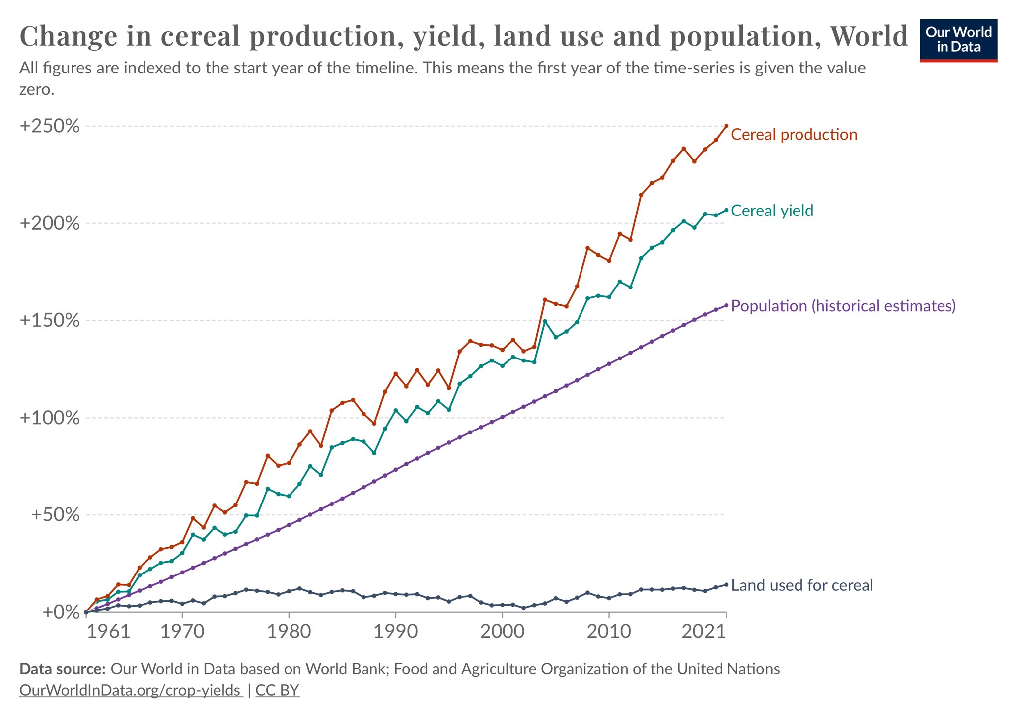 Y la tercera razón para no temer el libre mercado tiene que ver con la productividad. Se trata de un indicador clave para medir la competitividad de una empresa, sector o país, puesto que indica el valor de la producción en relación con los recursos (coste) empleados. El mundo produce hoy muchos más alimentos que décadas atrás usando los mismos recursos, a pesar de dispararse la población, tal y como refleja el siguiente gráfico referido al cereal, por ejemplo.