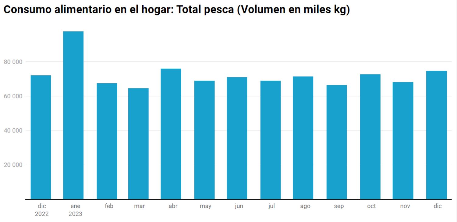Atendiendo al desglose por mes del último año, observamos que pese al leve incremento de noviembre, el consumo de pescados y mariscos todavía sigue siendo muy bajo.