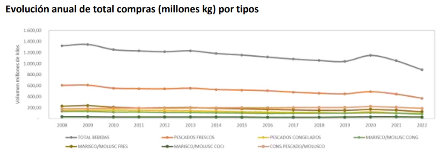 En efecto, la evolución del consumo de pescado es preocupante. De acuerdo con el Informe del consumo de alimentación en España 2022, elaborado por el Ministerio de Agricultura, en el año 2022, la compra de pescado fresco por parte de los hogares españoles decreció un 16,9%. Como podemos comprobar, la evolución anual del total de compras (expresadas en millones de kilogramos) representa una disminución generalizada en el sector.