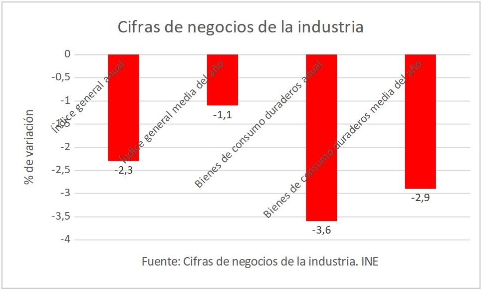 Las cifras de negocios de la industria muestran ese descenso en noviembre, con una caída tanto en el índice general como en los bienes de consumo duraderos, que anticipan más las expectativas, al tratarse de fabricación de bienes que son los primeros que se ralentizan cuando se prevé un empeoramiento de la situación, por el importe más elevado de su coste y el replanteamiento de dicho consumo por parte de los consumidores, que tiene su reflejo en el descenso de producción industrial de los mismos.