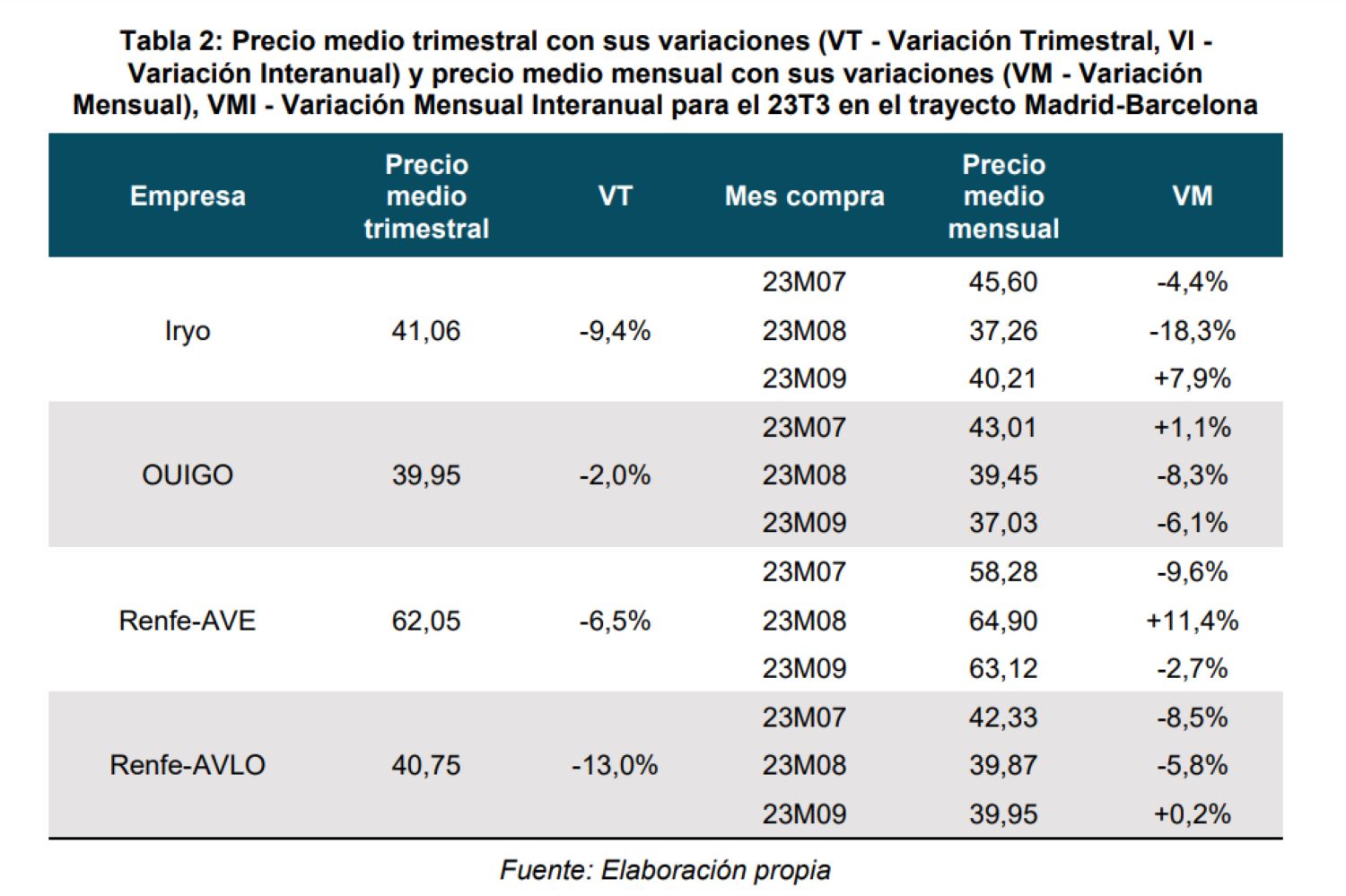 Sin embargo, en el corredor Madrid-Málaga, mientras que Iryo redujo sus precios un 18,8%, Renfe-AVLO hizo lo propio en un 18,3% y, con todo, Renfe-AVE redujo sus precios un 19%. Asimismo, para la ruta entre Madrid y Valencia, la reducción del precios de los billetes de Iryo fue del 13,7%, los de Ouigo se abarataron un 4,3%, los de Renfe-AVLO un 11,6% y, finalmente, los de Renfe-AVE se redujeron en un 16,3%.