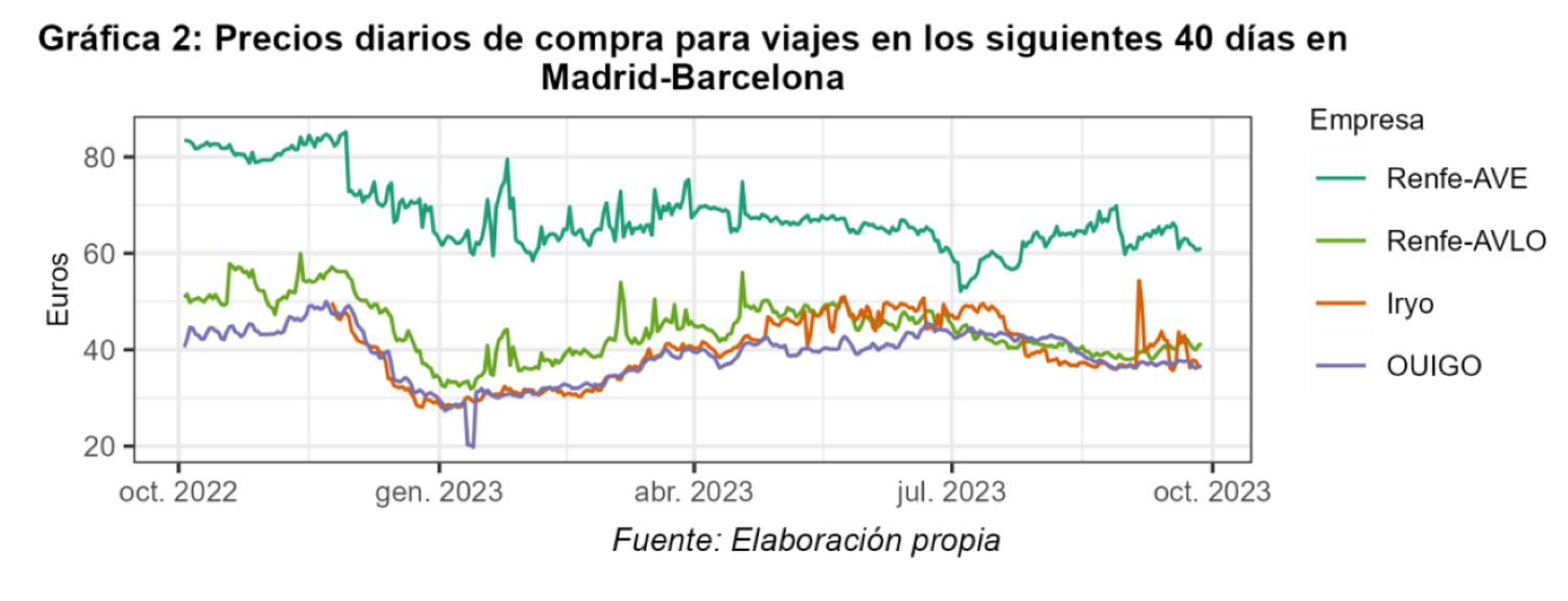 Del mismo modo, si atendemos a la evolución de los precios diarios de compra en este mismo corredor, podemos comprobar que la mayor disminución de los precios desde octubre del año 2022 la registra Renfe-AVE.