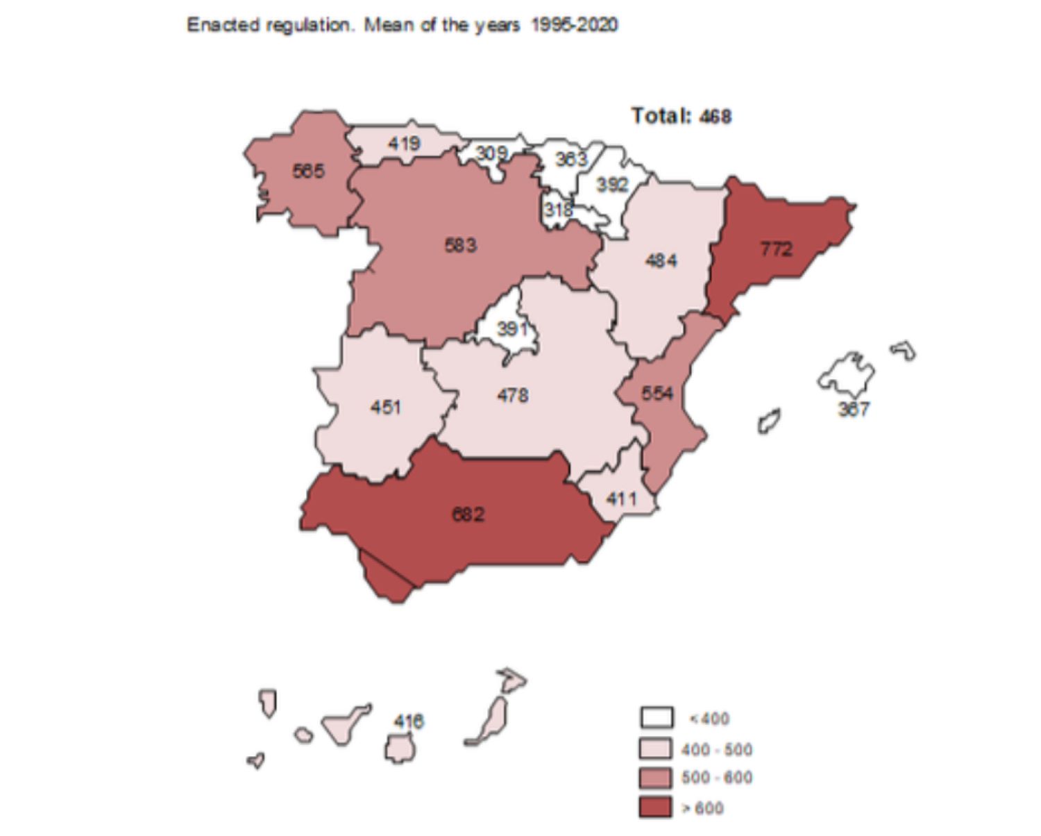 Como podemos ver, las regiones en las que existen un mayor nivel de regulación son Cataluña y Andalucía, ambas con una media de más de 600 normas por año. Del mismo modo, Galicia, Valencia y Castilla y León superan las 500 normativas anuales, mientras que Extremadura, Castilla-La Mancha, Asturias, Aragón y Murcia cuentan con más de 400 regulaciones cada año. Por su parte, Cantabria, País Vasco, Navarra, La Rioja y Madrid cuentan con menos de 400 normas de media cada año.