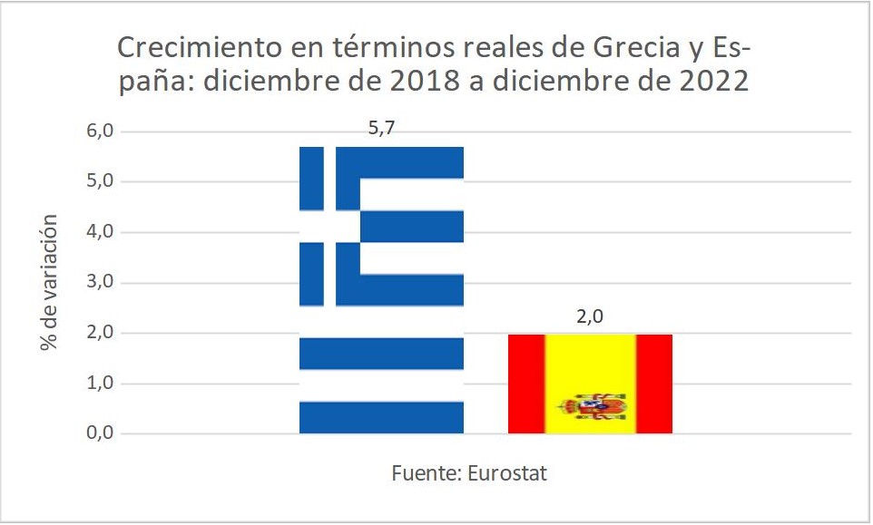 De esa manera, si analizamos el crecimiento económico desde que Sánchez es presidente, y comparamos con 2022, último año para el que hay datos tanto para Grecia como para España, vemos cómo, en términos reales, Grecia ha crecido en ese período un 5,7% frente al 2% español. Incluso si tomamos el dato de crecimiento de España para 2023 y lo comparamos con 2018, aunque Grecia no hubiese crecido nada en 2023, seguiría creciendo más que España (un 5,7% frente a un 4,5%, respectivamente).