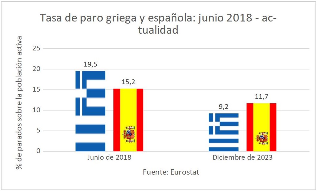 Eso se traduce en la tasa de paro. En ese período, se ha invertido la posición de España y Grecia. En junio de 2018, Grecia tenía una tasa de paro del 19,5% y España del 15,2%. En diciembre de 2023, último dato disponible en Eurostat para ambos países, la tasa de paro griega se encuentra por debajo de la española: 9,2% frente a 11,7%, respectivamente. Mientras Grecia la rebaja más del 50%, el descenso español no llega a la cuarta parte.