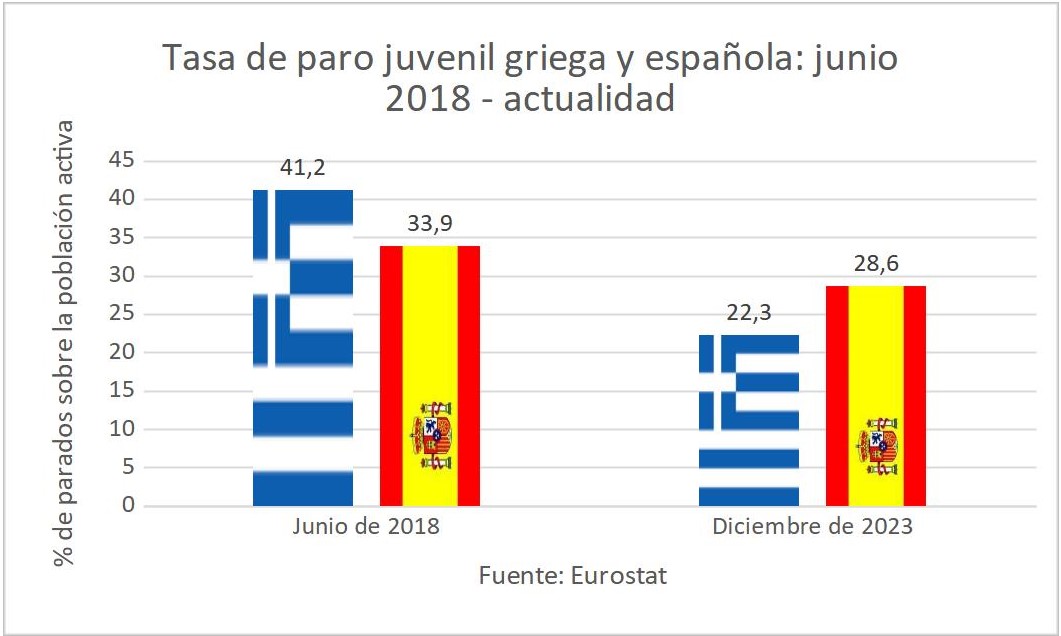 Lo mismo sucede con la tasa de paro juvenil: en junio de 2018, la tasa de paro juvenil en Grecia era del 41,2% y la española del 33,9%. En diciembre de 2023, la griega era del 22,3% frente al 28,6% de la tasa de paro juvenil española.