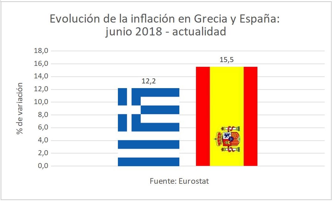 Si analizamos la inflación armonizada, entre junio de 2018 y enero de 2024 ha crecido un 12,2% en Grecia, mientras que en España lo ha hecho un 15,5%.
