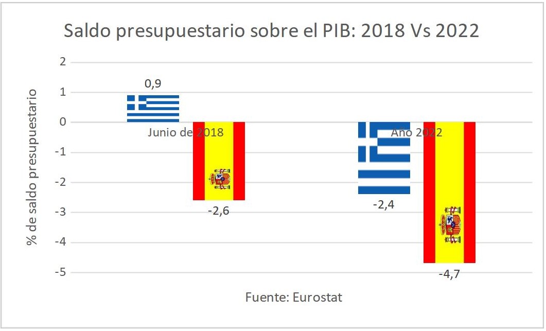 Como Sánchez, además, ha sostenido el crecimiento -menor, como hemos visto, que el griego desde que gobierna- con el gasto público, ha provocado que el saldo presupuestario tenga un peor comportamiento en España que en Grecia: Grecia pasa de un superávit en 2018 del 0,9% a un déficit del 2,4% en 2022 (último dato disponible), pero es que España pasa en el mismo período de un déficit del 2,6% al 4,7%. Esto es fruto de la presión del gasto estructural, que pese al incremento de ingresos derivado de la inflación.