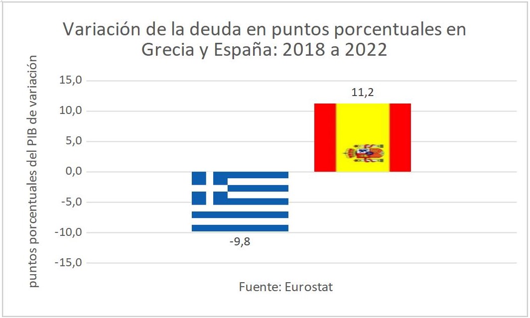 Eso hace que la deuda en España haya crecido exponencialmente, pese al fuerte incremento del PIB nominal derivado de la inflación. De esta forma, mientras la deuda ha bajado 9,8 puntos de PIB entre 2018 y 2022, la española ha aumentado 11,2 puntos en el mismo período, veinte puntos de diferencia con la evolución de la deuda griega.