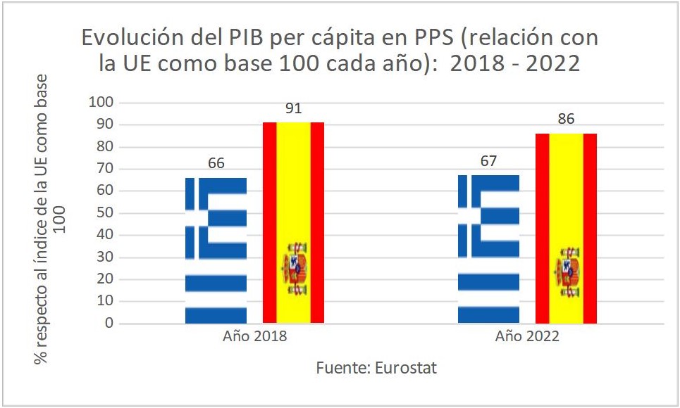 Todo hace que se produzca un empobrecimiento de la sociedad española. De esa forma, tomando el dato de la UE como base 100 para cada año, el índice de Grecia representa el 66% del PIB en PPS en 2018 y sube un punto, a 67, para 2022. Sin embargo, el dato español baja de 91 a 86.
