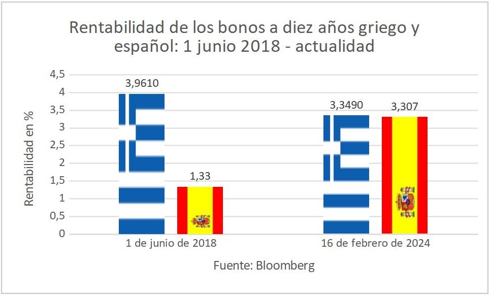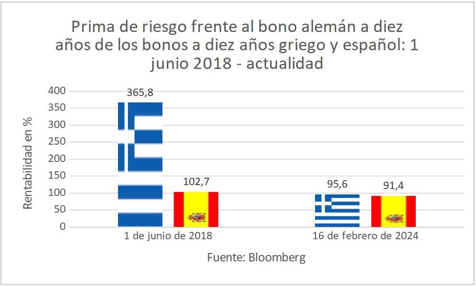 Eso hace que la prima de riesgo respecto al bono alemán haya pasado en el caso griego de 365 puntos básicos en junio de 2018 a 95 puntos básicos, mientras que en el caso español apenas ha bajado: de 102 ha pasado a 91.