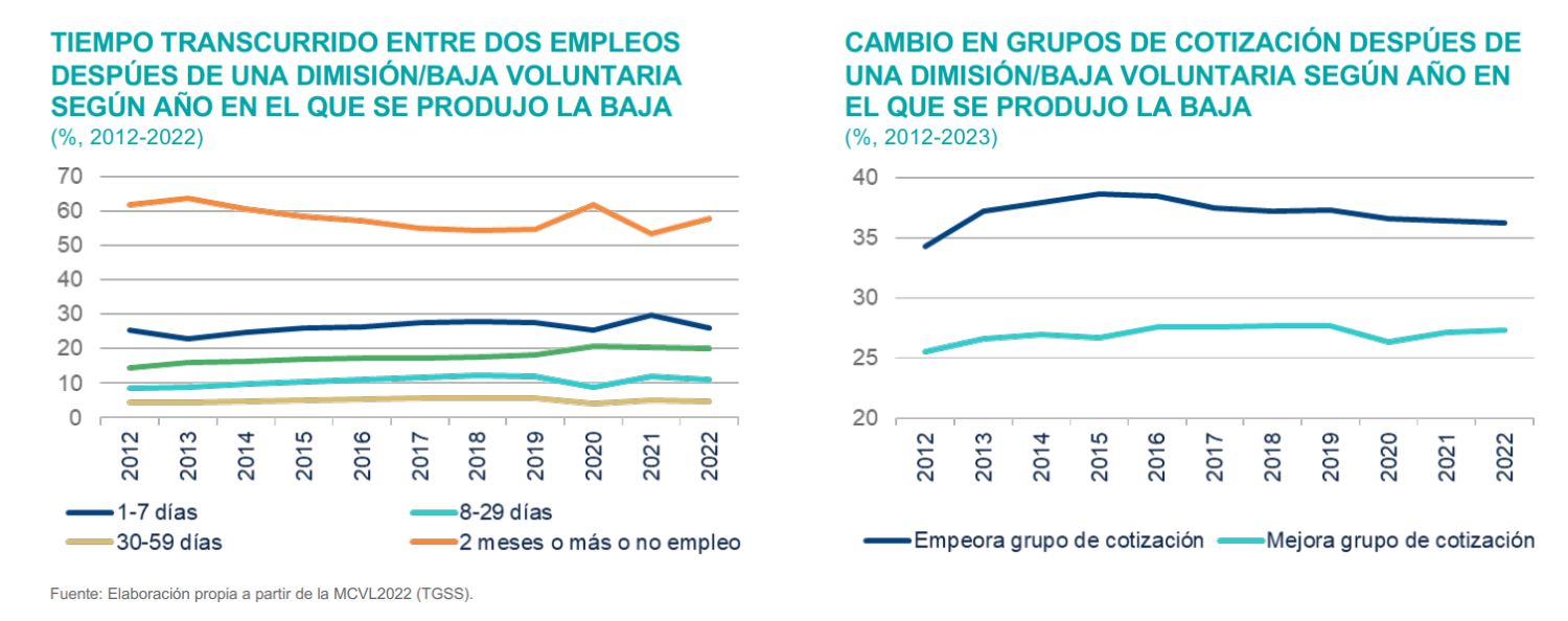 Por otra parte, la mayor parte de los nuevos empleos que se han logrado tras una renuncia de este tipo no reportan a los trabajadores un mejor salario. Así, "sólo el 27% de los empleos que se consiguen después de una baja por abandono voluntario tienen un grupo de cotización mayor que el empleo que se abandonó, y el 37% tiene un grupo de cotización inferior".