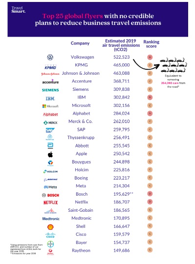 La empresa que según esta calificación peor se comporta es Volkswagen: la multinacional encabeza el listado de las compañías "sin planes creíbles para reducir sus emisiones en viajes de negocios" con unas emisiones de 522.523 toneladas de CO2. Suprimirlos, destacan, equivaldría a sacar de las carreteras 264.390 coches. Le siguen KPMG, Johnson and Johnson, Accenture, Siemens, IBM, Microsoft, Alphabet (matriz de Google), Merck, SAP y Thyssenkrupp. En la lista también están Apple, Meta, Shell, Bayer, Bosch y Netflix, entre otras.