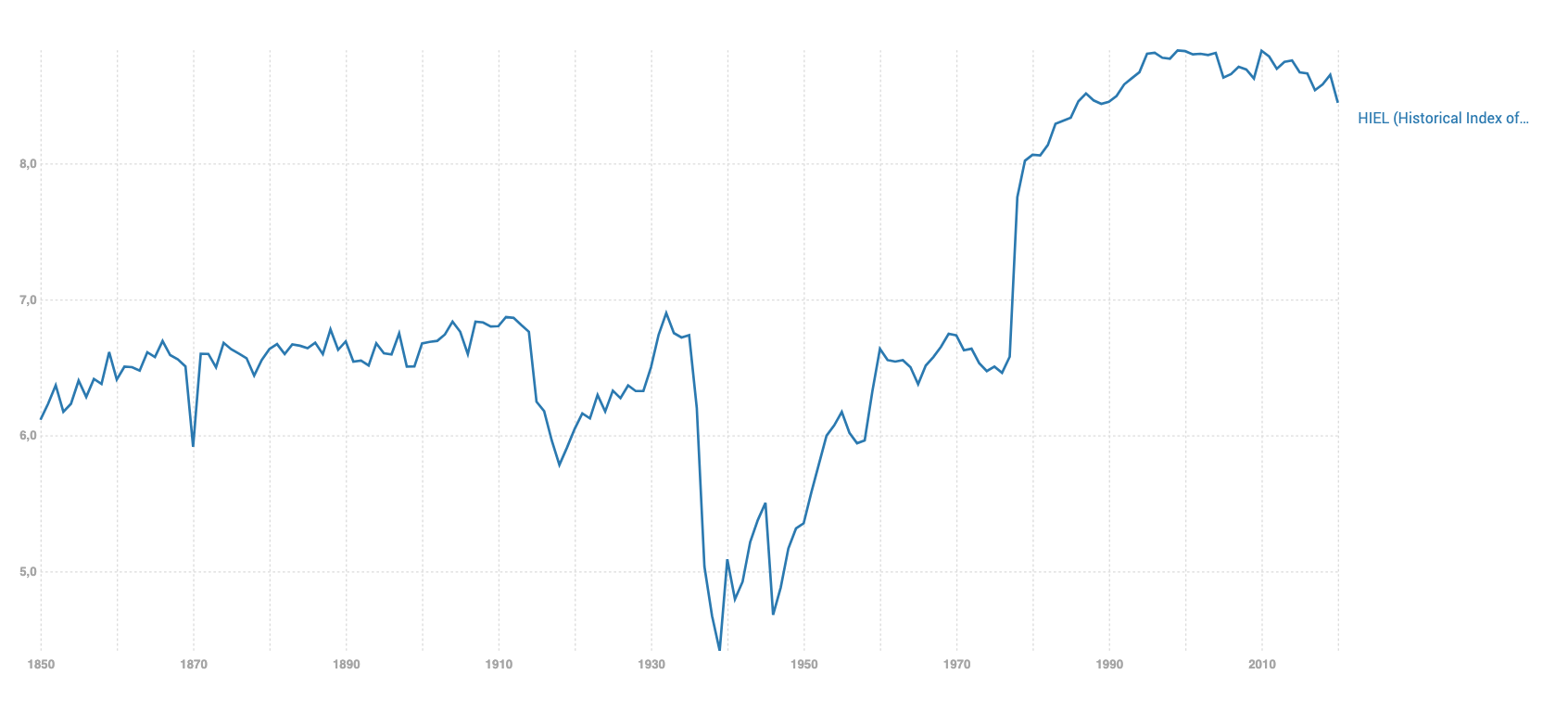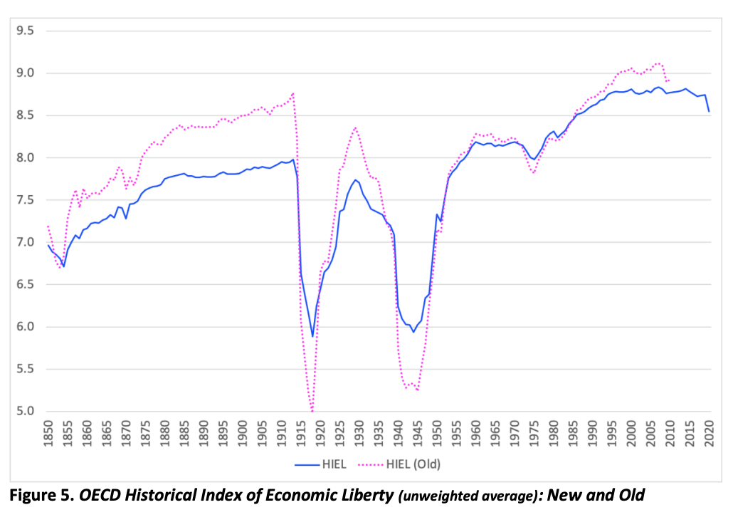 De especial interés es su Índice Histórico de Libertad Económica, desarrollado de la mano de la Fundación Rafael del Pino. Dicho trabajo ofrece una mirada certera a la evolución de esta métrica a lo largo de un siglo y medio de historia, permitiendo comprobar en qué medida los países que se abrieron al capitalismo en la segunda mitad del siglo XIX lograron un despegue económico similar al que luego experimentaron quienes siguieron esa misma senda en épocas posteriores.