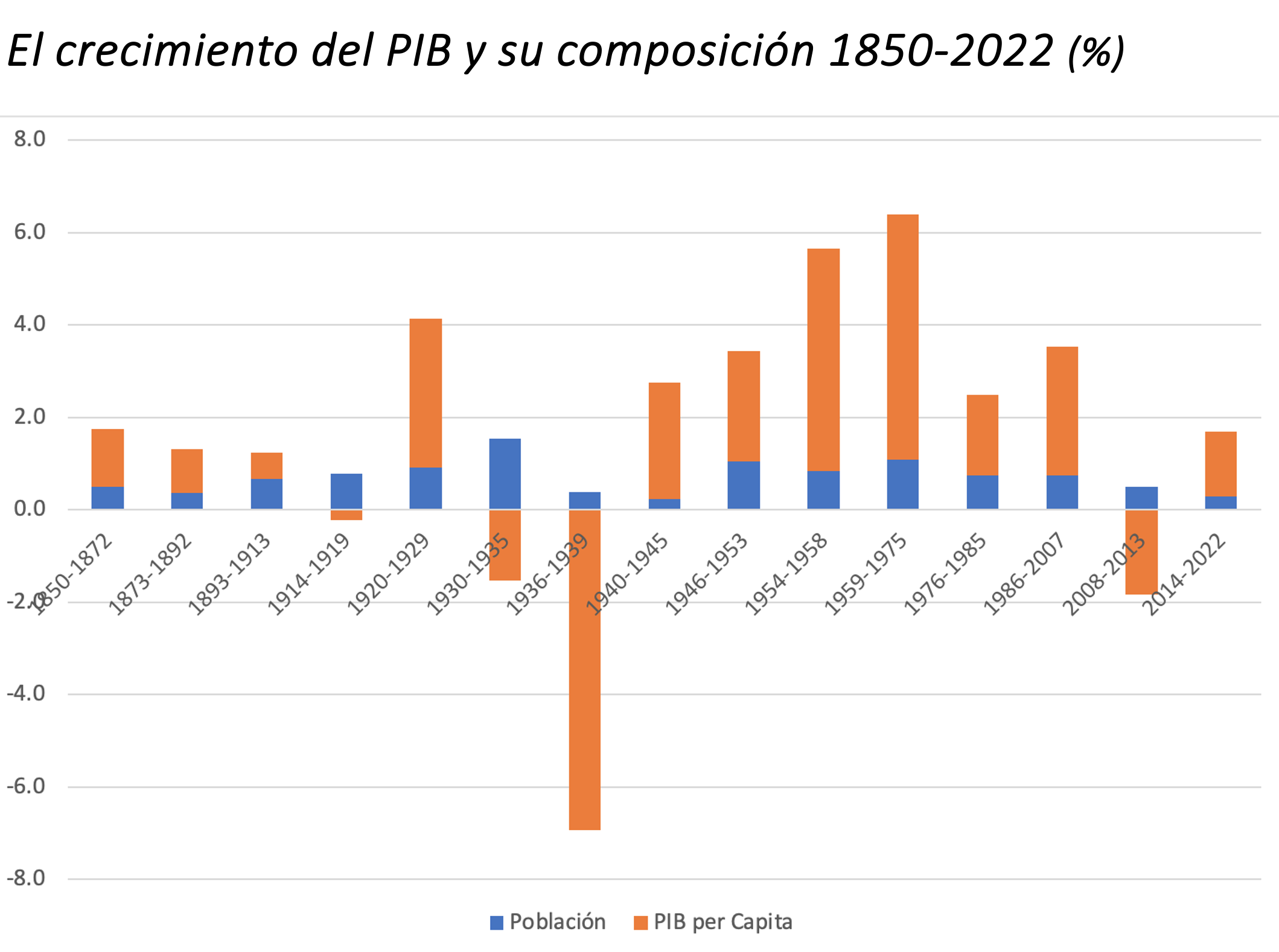 Las investigaciones de Leandro Prados de la Escosura también resultan de interés en lo referido al proceso de declive que viene sufriendo nuestra economía. En el siguiente gráfico podemos ver cómo el crecimiento se aceleró entre 1940 y 1975, para después volver a experimentar un repunte de 1986 a 2007. En cambio, el PIB redujo su tamaño entre 2008 y 2013 y creció débilmente desde entonces.