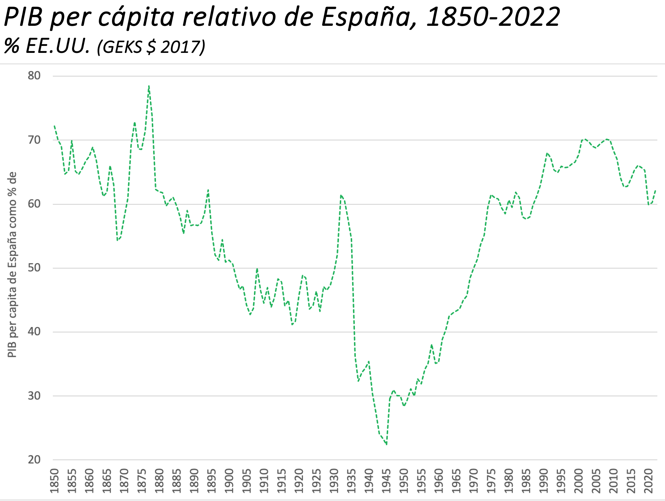 Esta falta de crecimiento se traduce en atraso económico, puesto que otros países experimentan niveles de desarrollo más acelerados. Así, en relación con Estados Unidos, el PIB per cápita de nuestro país llegó a estar un 80% por debajo de los niveles alcanzados en la economía norteamericana. Este mínimo, alcanzado tras la Guerra Civil y la II Guerra Mundial, vino seguido de un crecimiento casi ininterrumpido que nos llegó a situar un 30% por debajo de las cotas alcanzadas en Estados Unidos. Sin embargo, este indicador es queda ahora casi un 40% inferior.