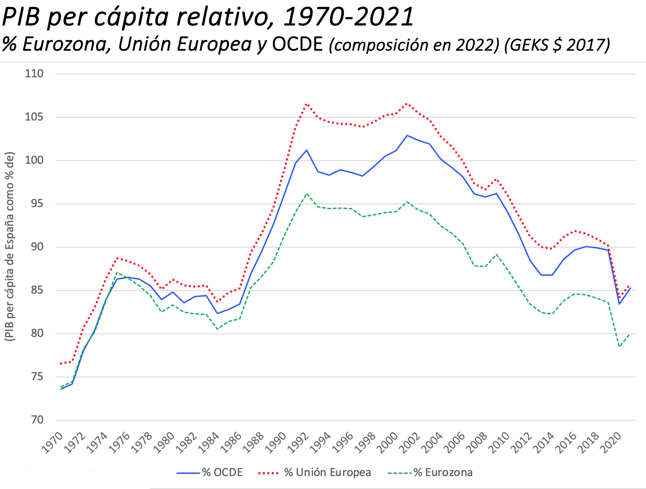 Ocurre lo mismo si nos fijamos en los niveles de PIB per cápita de la Unión Europea, la Eurozona o la OCDE. En relación con estos tres bloques, los datos que hoy se alcanzan en España son los peores de los últimos cuarenta años y se sitúan, de hecho, en terrenos similares a los de los últimos años del franquismo y los primeros compases de la democracia. Estamos un 15% por debajo del PIB per cápita medio de la OCDE y la Unión Europea y un 20% por debajo de los niveles alcanzados en la Eurozona.