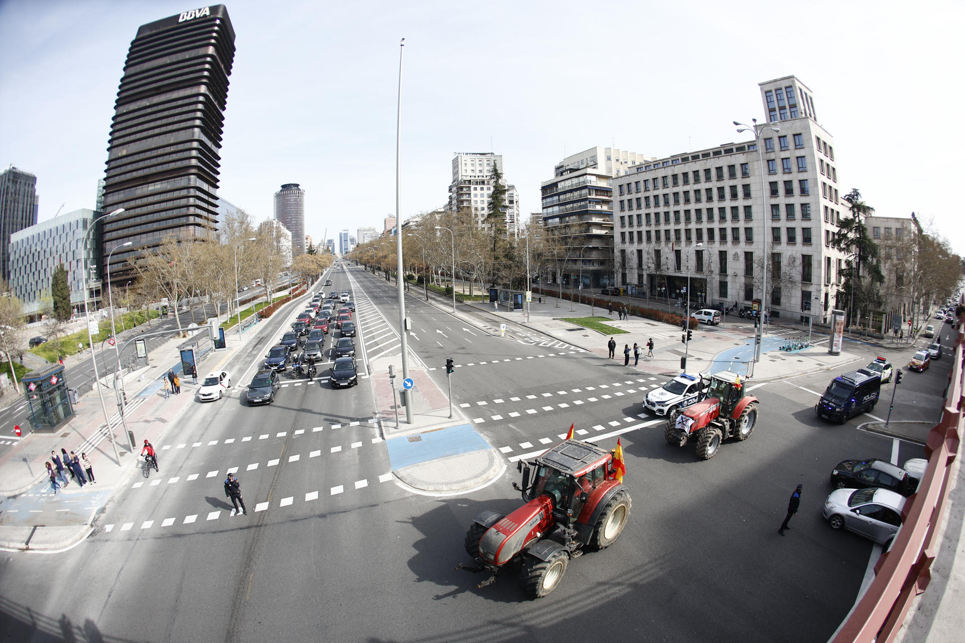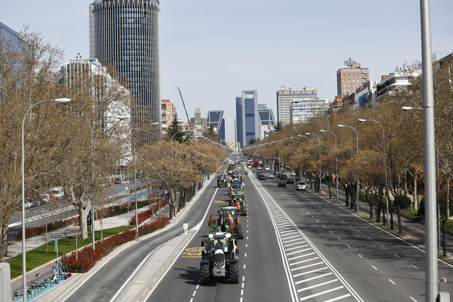 Varios tractores y manifestantes participan en una nueva concentración de agricultores y ganaderos cortando el Paseo de la Castellana.