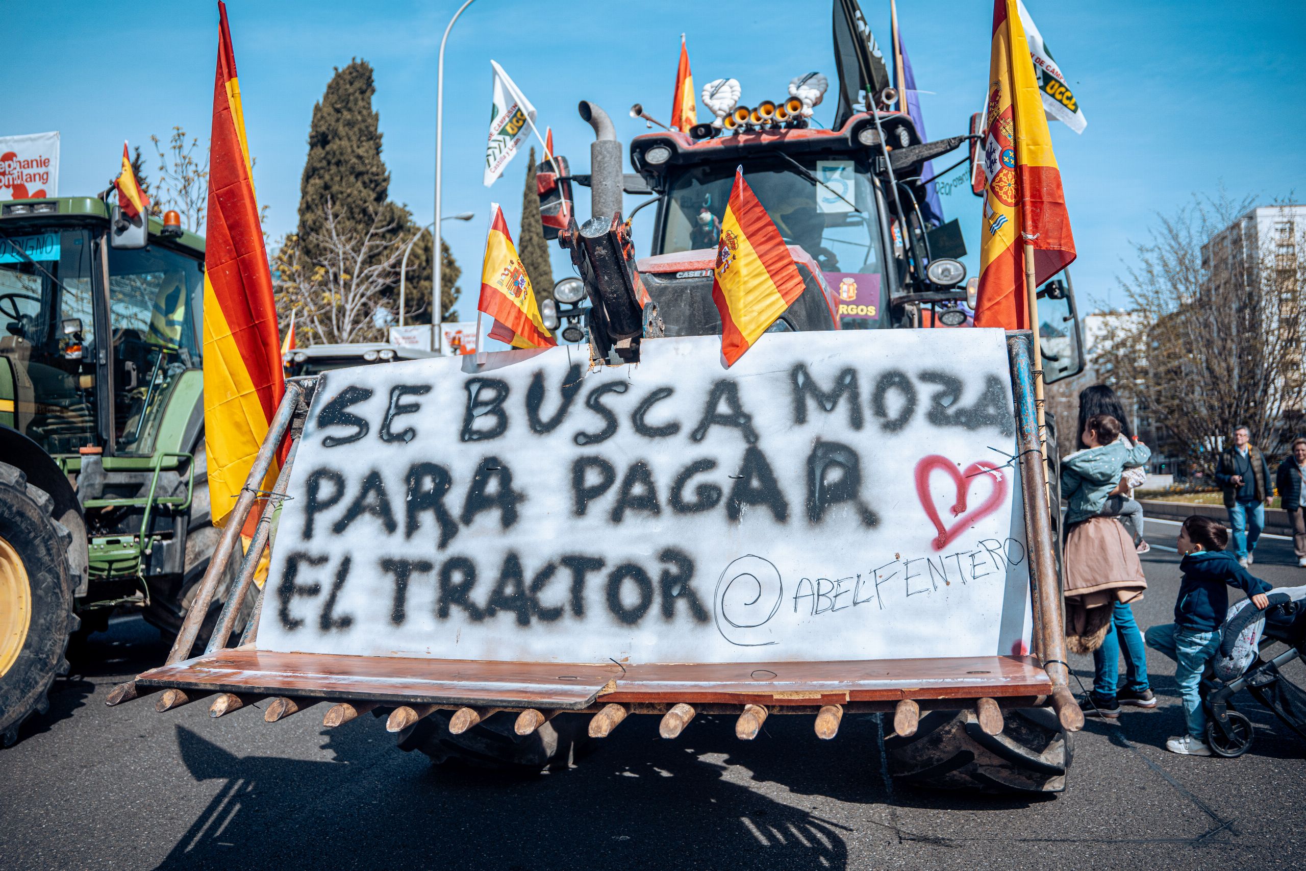 Otro tractor que participa en la protesta de Madrid con una pancarta inquietante.