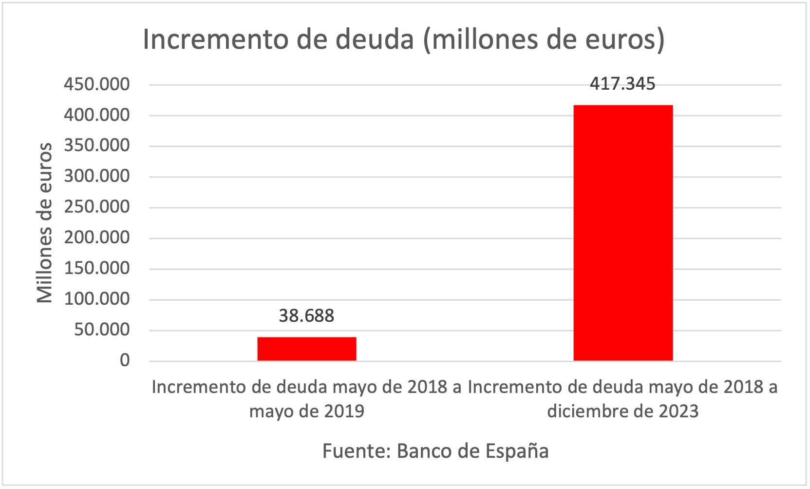 Por tanto, vemos cómo el gasto público es el que mantuvo artificialmente en pie a la economía durante 2023 y durante el quinquenio de Sánchez, con un impulso que lleva a la economía a un crecimiento que no se puede sostener por sí mismo, sino que cuando se retire el estímulo público, caerá, habiendo dejado a la economía productiva anquilosada, al no haber aplicado ninguna reforma estructural, y al sector público con una deuda colosal en los últimos cinco años y medio, donde ha aumentado más de 400.000 millones de euros.