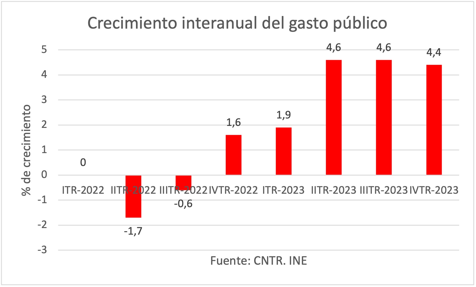 El crecimiento del PIB de un año se calcula como la media de los crecimientos interanuales de los cuatro trimestres de dicho ejercicio. ¿Qué sucede en este caso? Que el INE estimó un crecimiento del IVTR-2023 que, sorprendente e inexplicablemente, se aceleró basado en una sorprendente recuperación de las exportaciones y en el incremento del gasto público muy por encima de lo esperado, tal y como señala el informe trimestral de proyecciones macroeconómicas del Banco de España. De esa forma, ese sector exterior que languidece pareció revivir por unos instantes en ese IVTR-2023, para llevar el crecimiento del PIB intertrimestral al 0,6%.