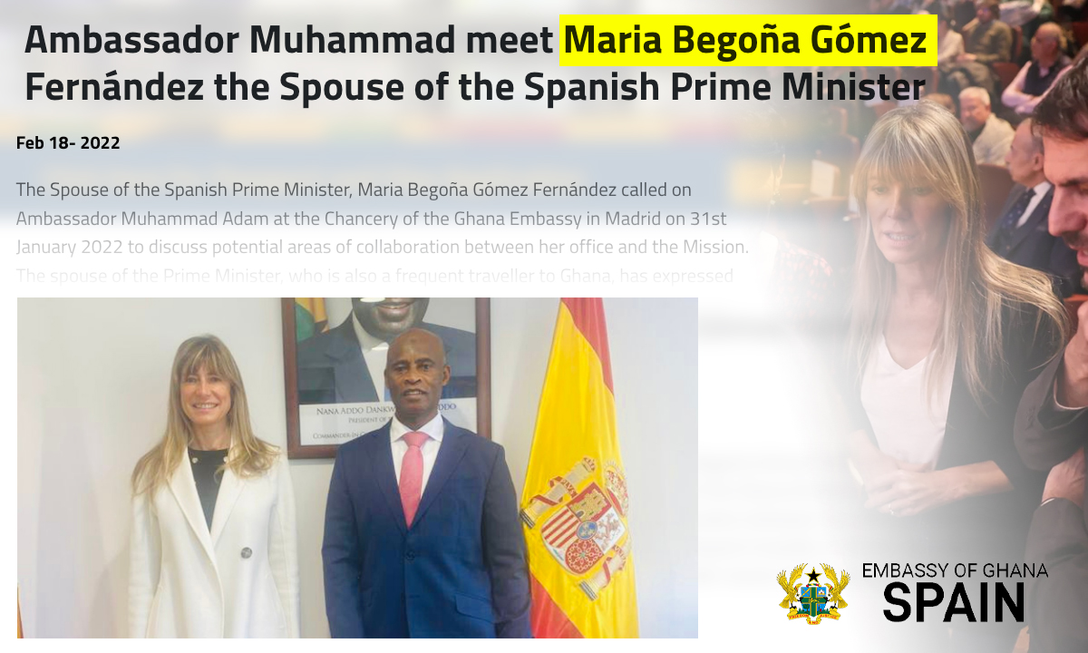 Fue el 18 de febrero de 2022. Se trató de una nota de la Embajada del país africano en la que el embajador Muhammad narraba su "recepción a María Begoña Gómez Fernández, esposa del Presidente del Gobierno español". Así la definió. No como directora del Africa Center. La nota dio más detalles y aseguró que la "esposa del Primer Ministro español, María Begoña Gómez Fernández, visitó al embajador Muhammad Adam en la Cancillería de la Embajada de Ghana en Madrid el 31 de enero de 2022 para discutir posibles áreas de colaboración entre su oficina y la Misión".