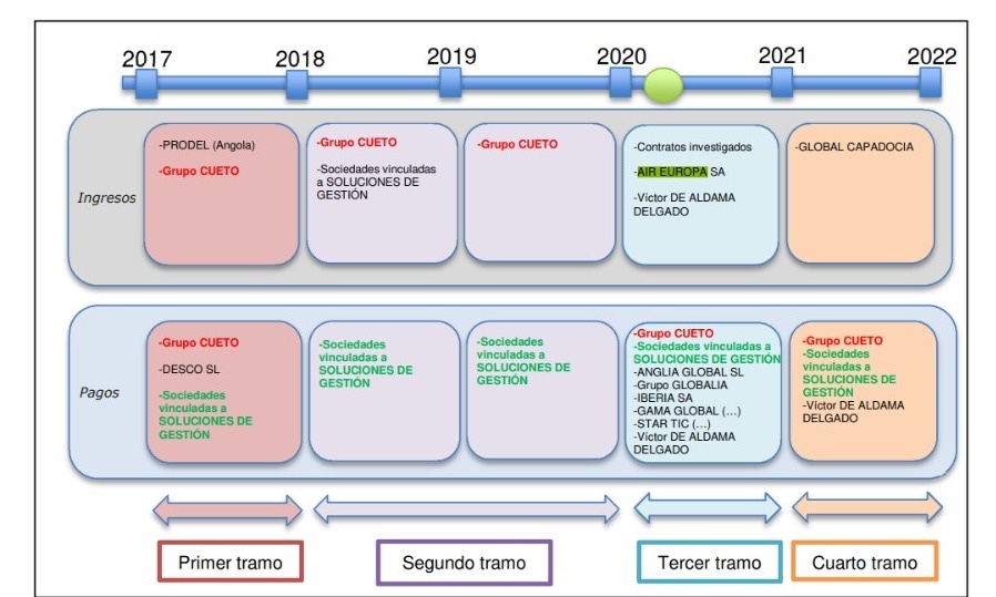 El gráfico plasma un croquis distribuido por años en el que se puede ver en síntesis la labor desarrollada hasta el momento por la UCO (Unidad Central Operativa de la Guardia Civil) y las evidencias encontradas. Comienza en 2017 y en ese año señala dos conceptos: PRODEL (Angola) y Grupo Cueto. Hay que recordar que el Grupo Cueto está involucrado en otro caso precisamente por su labor en Angola. En el año 2018, el mapa del caso vuelve a incluir al Grupo Cueto y destaca ya como sociedad vinculada a Soluciones de Gestión, una de las sociedades ligadas a la trama del PSOE. En 2019 la UCO vuelve a remarcar la evolución del Grupo Cueto y en 2020, año en el que se negoció el rescate de Air Europa aparece la siguiente indicación: "Contratos investigados. Air Europa SA. Víctor de Aldama. Ese mismo año, en el apartado "pagos" vuelve a figurar una anotación al Grupo matriz de Air Europa: "Grupo Globalia", señala el texto de la UCO. Y el nombre de Aldama vuelve a aparecer en 2021.