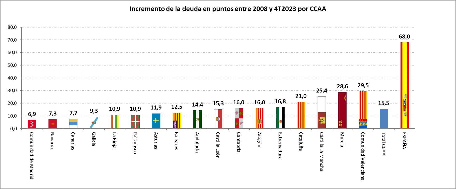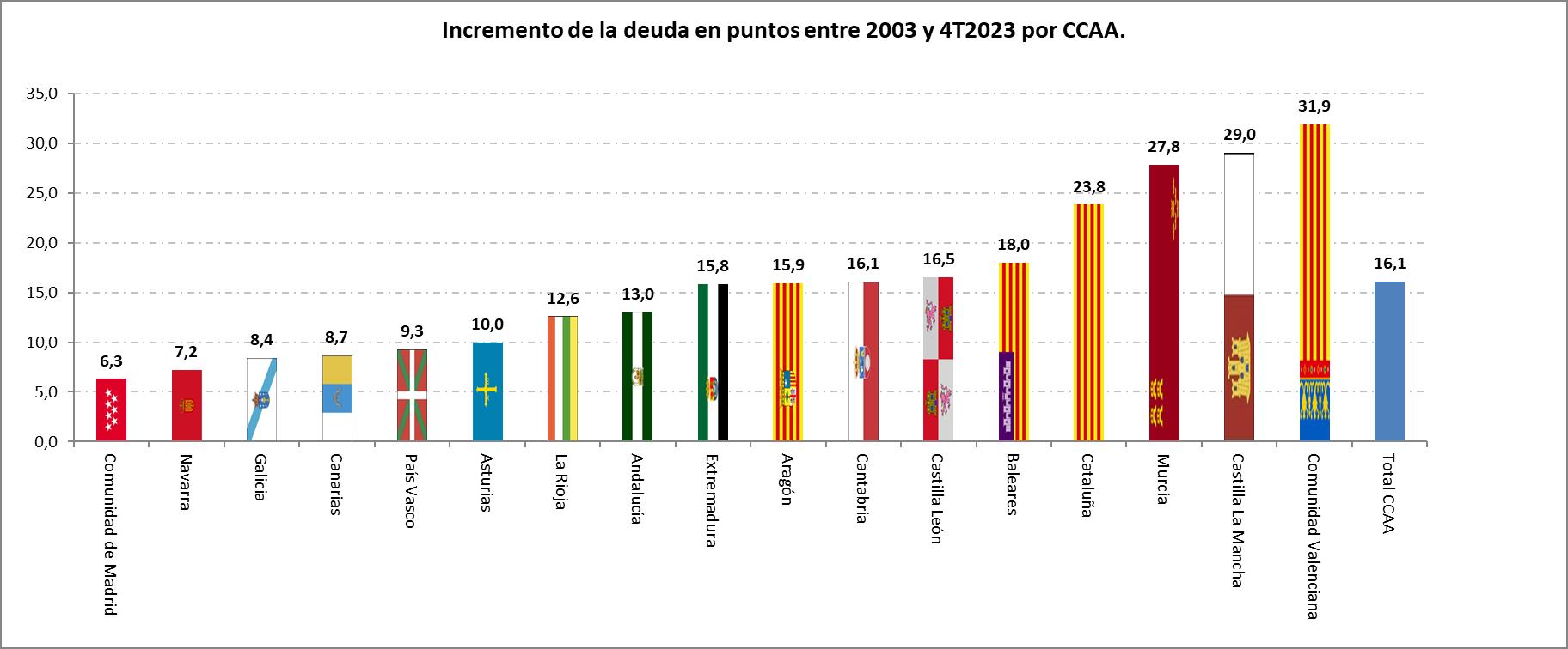 Y si lo analizamos en un período más amplio, desde 2003, momento en el que en Madrid se inicia la adopción de las políticas de mayor libertad económica, el resultado también es muy significativo, al incrementarse la deuda en Madrid en 6,3 puntos frente al aumento de 23,8 puntos en Cataluña (casi cuatro veces más que en Madrid), y 16,1 puntos en la media regional.