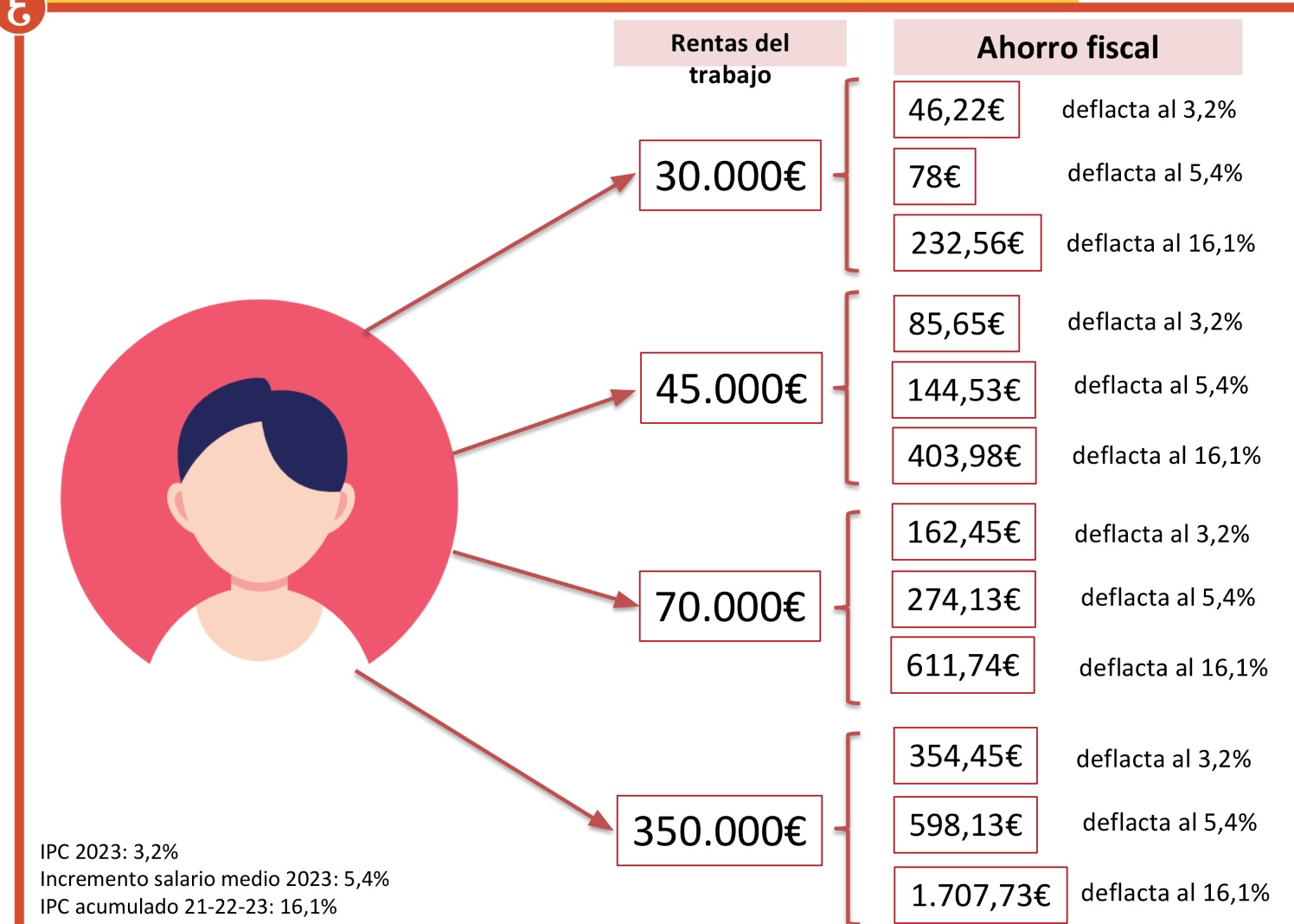 Como ejemplo práctico, los expertos del REAF han elaborado varias tablas con diferentes escalas salariales y el ahorro que supondría la deflactación de la tarifa para cada contribuyente.