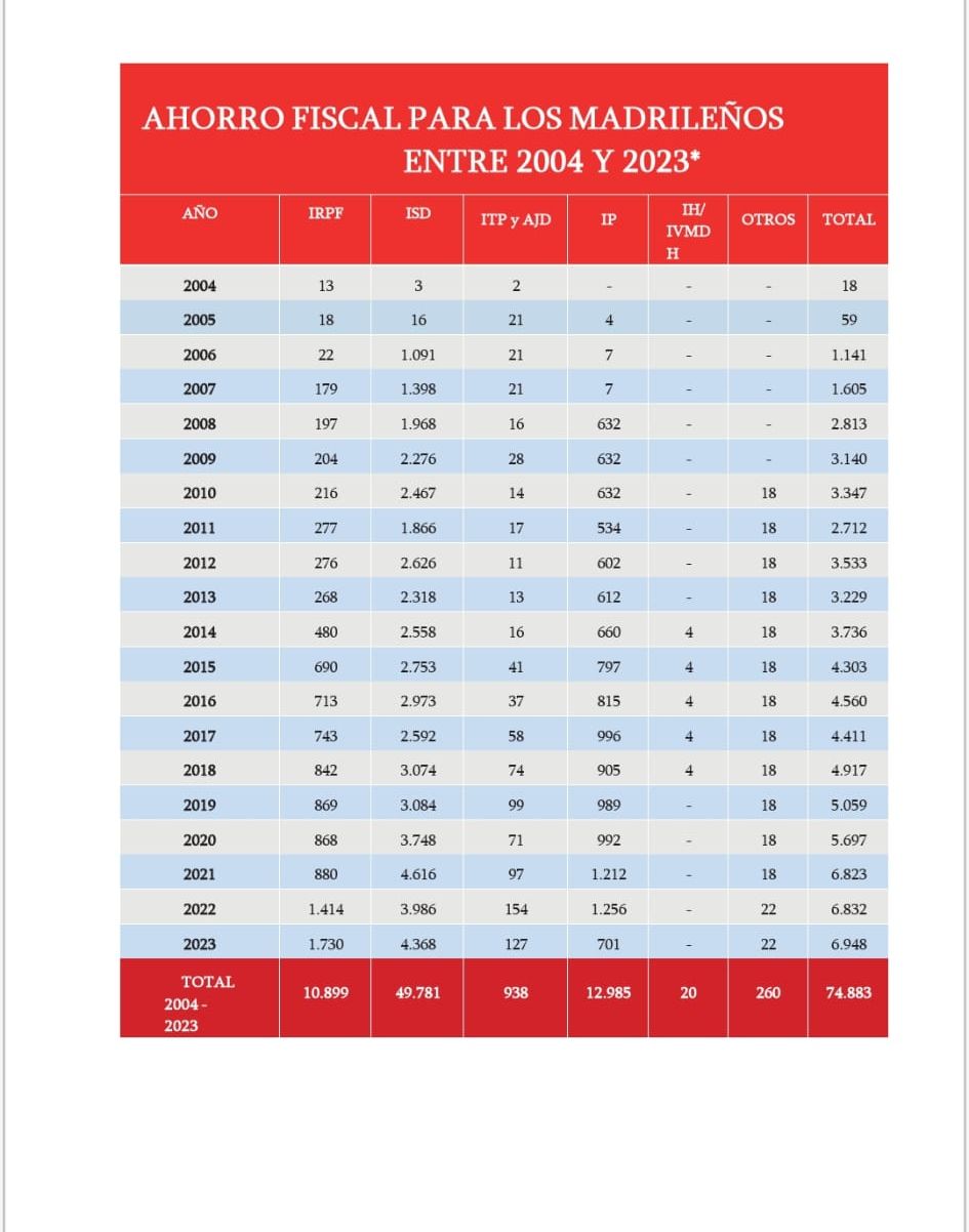 Además, los contribuyentes de la región llevan dos décadas beneficiándose de ese alivio impositivo. Según los cálculos del Gobierno regional, desde que se aprobaron las primeras bajadas de impuestos en 2004, los madrileños se han ahorrado 74.883 millones de euros en impuestos, "o lo que es lo mismo, 20.800 euros por contribuyente" señalan.