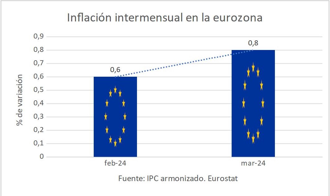 La inflación repunta, y lo hace con fuerza. Aunque la inflación interanual en la eurozona ha pasado del 2,6% al 2,4%, el dato mensual ha crecido del 0,6% al 0,8%, viniendo, además, de un crecimiento en febrero de un 0,6% intermensual. Por tanto, la inflación no desciende, sino que se acelera en términos mensuales.