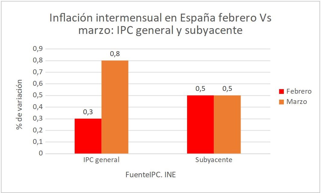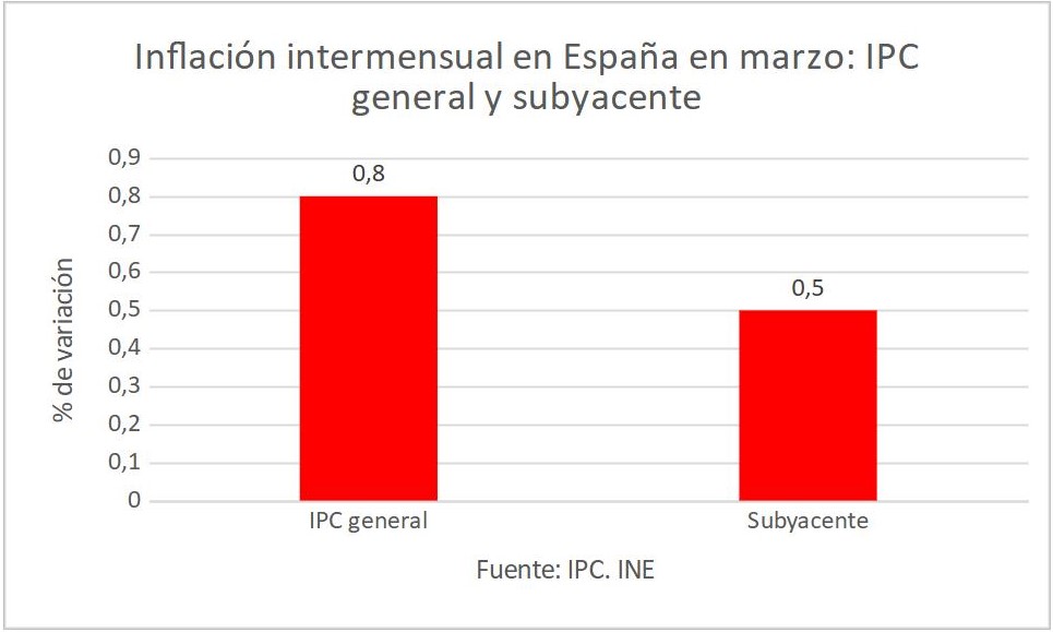 Esto supone una aceleración también en la tasa mensual, pues la subyacente se mantiene en el 0,5 intermensual, mientras que el IPC general pasa de un 0,5% intermensual en febrero a un 0,8% intermensual en marzo.