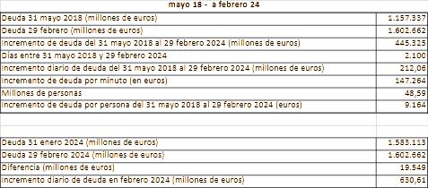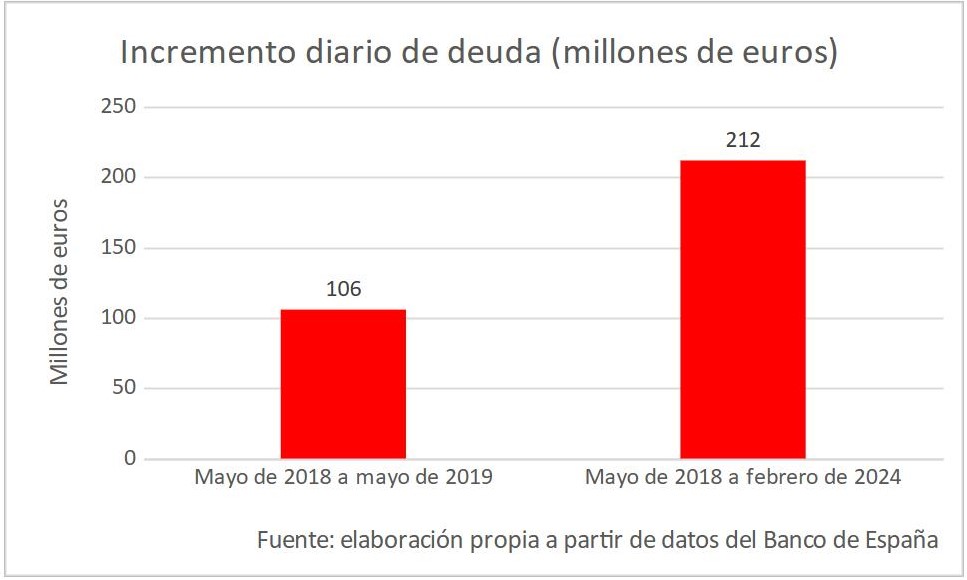 O visto de otra manera: en el primer año, la deuda se incrementaba a un ritmo de 105,99 millones de euros al día. Ahora, tras casi cinco años de Gobierno de Sánchez, la deuda crece 212,06 millones de euros cada día.