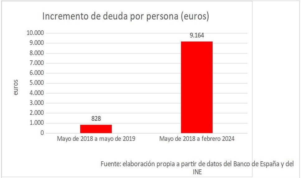 Así, si durante el primer año creció la deuda por persona en 828,03 euros, en los más de cuatro años de mandato de Sánchez la deuda por persona ha aumentado en más de 9.100 euros (9.164 euros, más de diez veces el incremento del primer año).