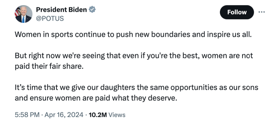 El presidente del país norteamericano, Joe Biden, se ha sumado a las críticas, compartiendo un tuit en el que afirma que "las mujeres deportistas siguen rompiendo fronteras y son una fuente de inspiración para todos, pero ahora mismo estamos viendo que, incluso si eres la mejor, a las mujeres no se les remunera con justicia. Es hora de que le brindemos a nuestras hijas las mismas oportunidades que a nuestros hijos, asegurando que las mujeres cobran lo que se merecen".