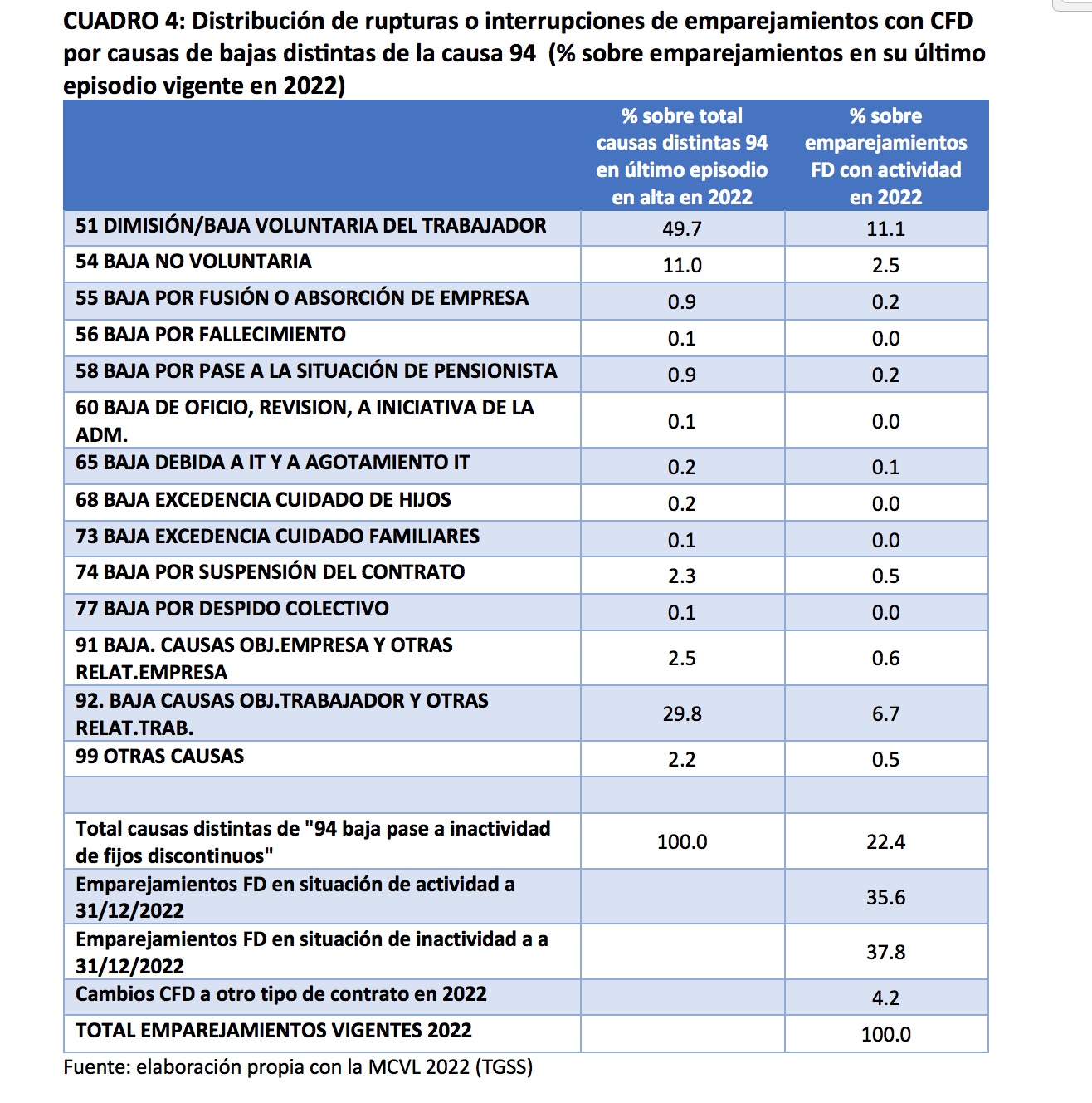 El think tank señala que, en 2022, el número de rupturas en la relación laboral por una baja distinta de la causa 94 (que es el pase a la inactividad de los fijos discontinuos) fue de 505.000, que representan al 22,4% del total de fijos discontinuos con algún período de actividad en 2022 (más de 2 millones).
