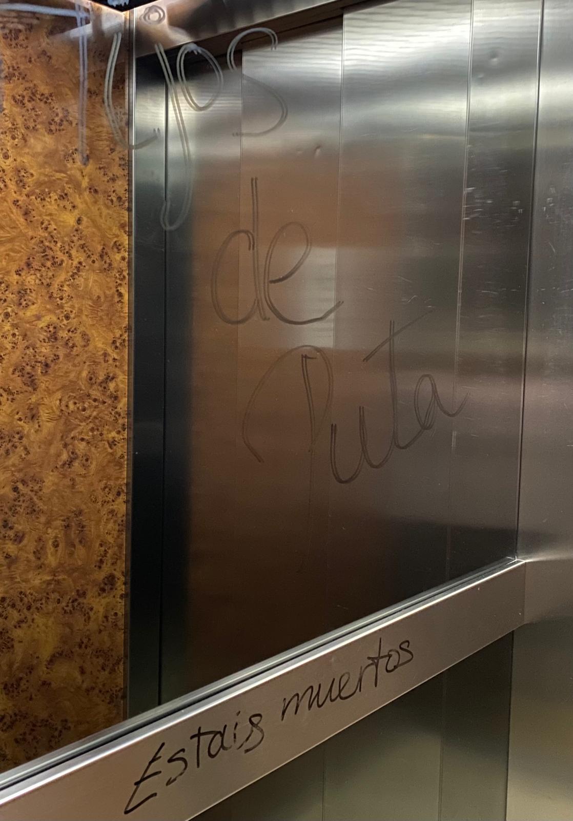 "Ellos van lanzando sus mensajes para atemorizarnos y de repente dicen... ‘va a haber pelea de mujeres y a la del 16 la van a poner que no la van ni a reconocer’. Y todo así -denuncia la presidenta de la comunidad-. En cuanto pones un cartel para avisar de lo que sea: ‘Te voy a matar, eres una hija de la gran puta…’. Y encima nos graban con el móvil. A mí me han grabado hasta la matrícula del coche descaradamente. ¿De verdad alguien cree que se puede vivir así?".