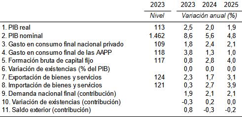 Mantiene un crecimiento del 2% para 2024 y del 1,9% para 2025. El crecimiento de 2024 tiene gran parte de efecto arrastre, pues con el dato sorprendente de crecimiento que dieron en el IVTR-2023, eleva el interanual de los tres primeros trimestres de 2024, de manera que sólo por ese efecto base el PIB crece 8 décimas.