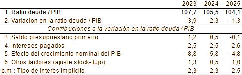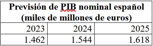 Con esa previsión de crecimiento de PIB nominal antes comentada es con lo que esperan, por efecto del cociente, que disminuya la deuda sobre el PIB, pero no por verdadera reducción de deuda en valores absolutos, ya que no alcanzan el superávit presupuestario. Además, si se produce alguna desviación de gasto y los ingresos comienzan a fallar, que es posible ante su optimista previsión de evolución de recaudación, ese cociente de deuda sobre el PIB subirá.