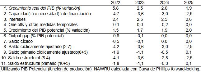 El crecimiento potencial del PIB (el estructural de la economía) sigue siendo bajo, elemento que pone en riesgo la sostenibilidad de las cuentas públicas en caso de recesión, con un saldo estructural muy negativo, que no parece que vaya a poder reducirse en la medida en la que lo plasman en el informe (que es el esfuerzo que ha pedido Bruselas).